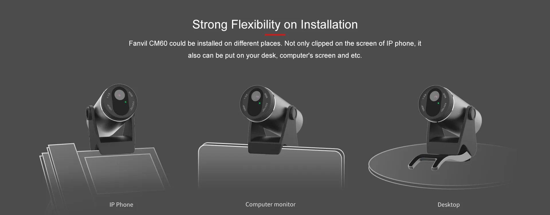 กล้อง USB แบบพกพา HD Fanvil CM60 ได้รับการออกแบบมาเป็นพิเศษสำหรับการจับคู่กับโทรศัพท์ IP ระดับไฮเอนด์ของ Fanvil Fanvil นำผลิตภัณฑ์ที่มีคุณค่ามากขึ้นมาสู่ลูกค้าของเราอย่างต่อเนื่อง เมื่อพิจารณาถึงรุ่นที่อัปเดตในอนาคตอันใกล้นี้ Fanvil CM60 ได้รับฟีเจอร์ที่ทรงพลังมากขึ้น เช่น ความละเอียด 1080P ความยืดหยุ่นในการติดตั้งสูง มีฝาปิดที่ปกป้องความเป็นส่วนตัว และอื่นๆ