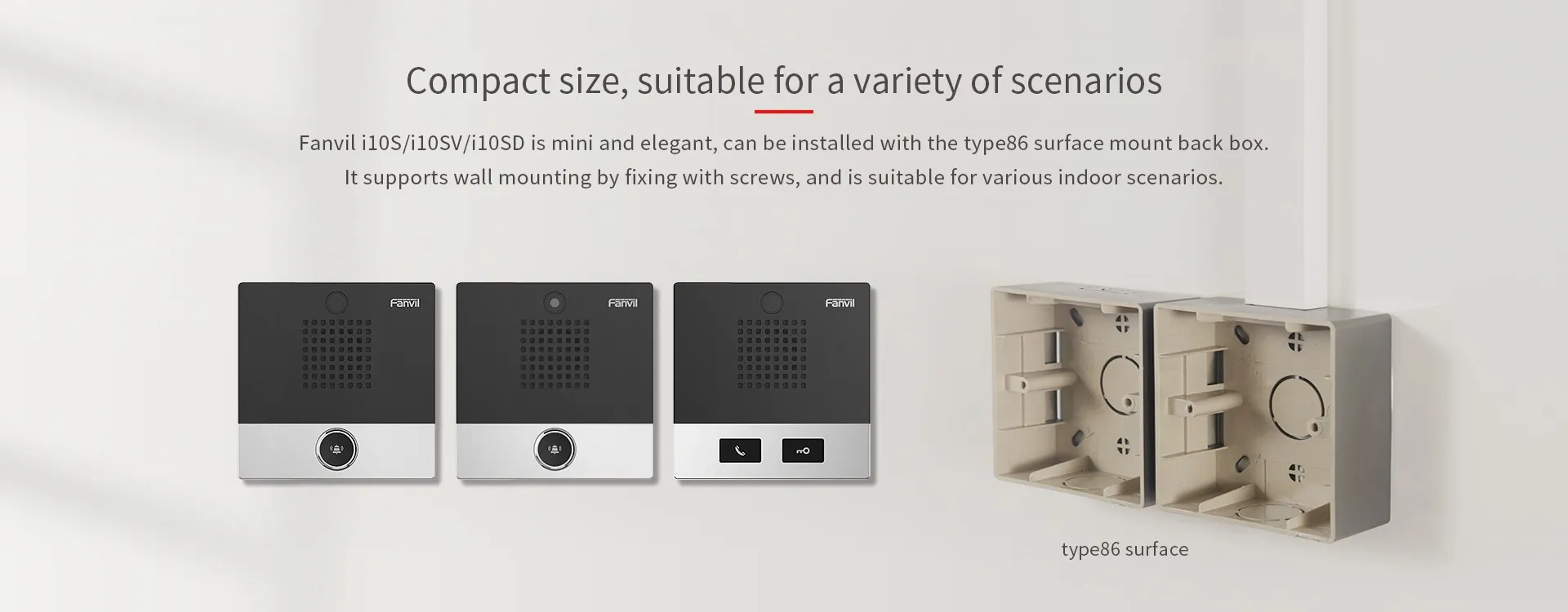 Fanvil i10S/i10SV/i10SD เป็น มินิ SIP อินเตอร์คอม บูรณาการการควบคุมการเข้าถึง อินเตอร์คอมเสียง/วิดีโอ และฟังก์ชันการออกอากาศ รองรับการติดตั้งบนผนัง ด้วยการออกแบบที่ป้องกันฝุ่นและกันน้ำ จึงสามารถนำไปใช้ในสถานการณ์ในร่มได้หลายรูปแบบ และมอบประสบการณ์การสื่อสารที่ดีที่สุดสำหรับผู้ใช้