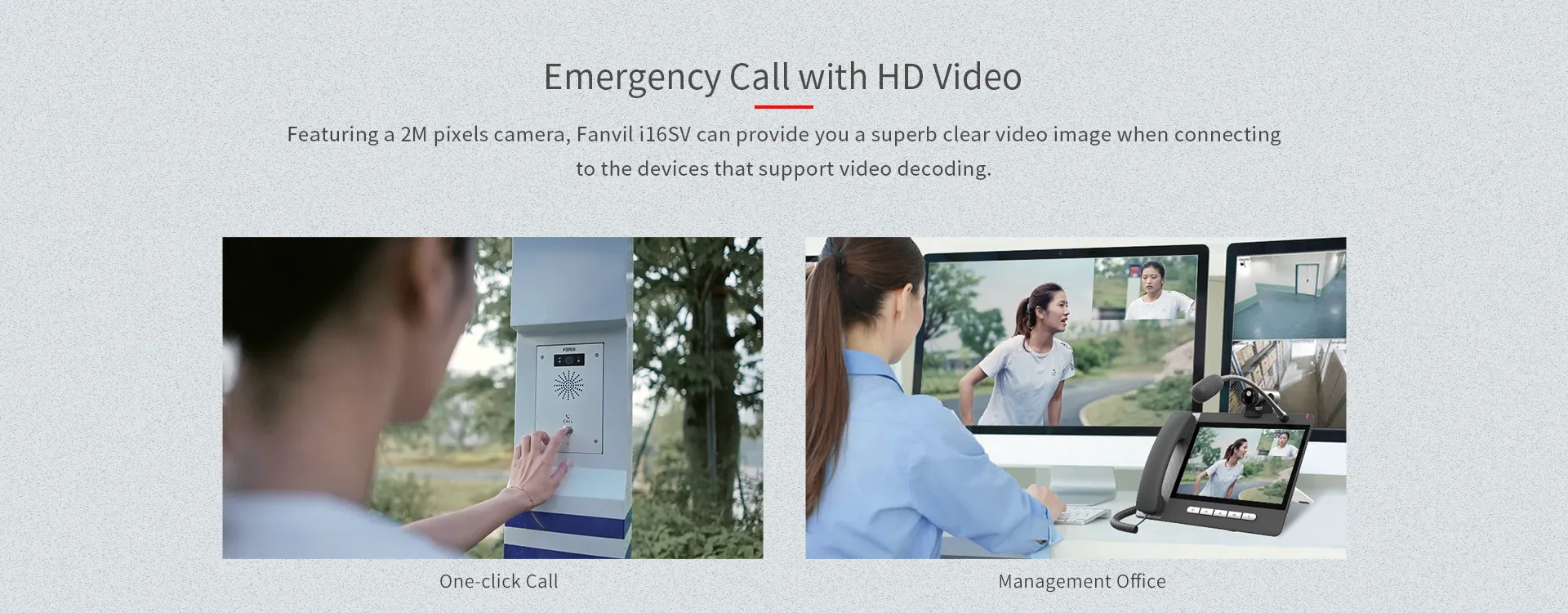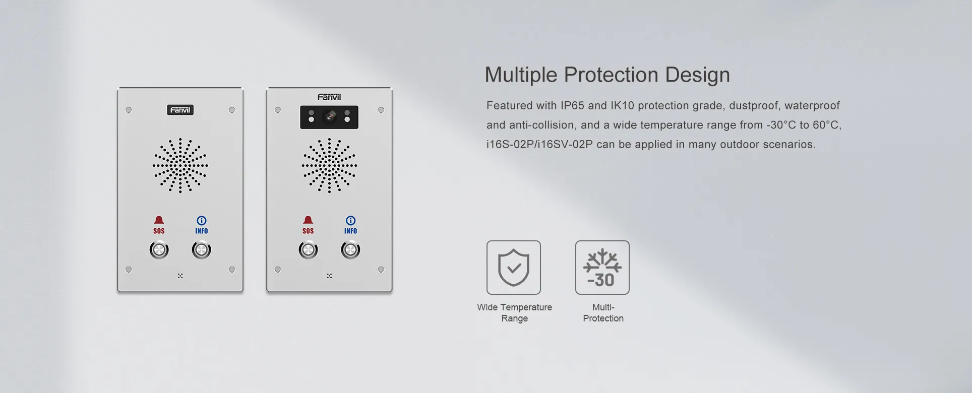 Fanvil i16S-02P/i16SV-02P เป็นอินเตอร์คอม SIP ที่มีรูปลักษณ์สวยงาม ผสานรวมอินเตอร์คอมเสียง/วิดีโอและฟังก์ชันการแพร่ภาพกระจายเสียง มีปุ่มลัด 2 ปุ่มและรองรับการติดตั้งบนผนัง ด้วยการออกแบบที่ป้องกันฝุ่น กันน้ำ และป้องกันการชนกันในระดับการป้องกัน IP65 และ IK10 ทำให้สามารถใช้งานได้ในสถานการณ์ในร่มและกลางแจ้งมากมาย และมอบประสบการณ์การสื่อสารที่ดีที่สุดสำหรับผู้ใช้