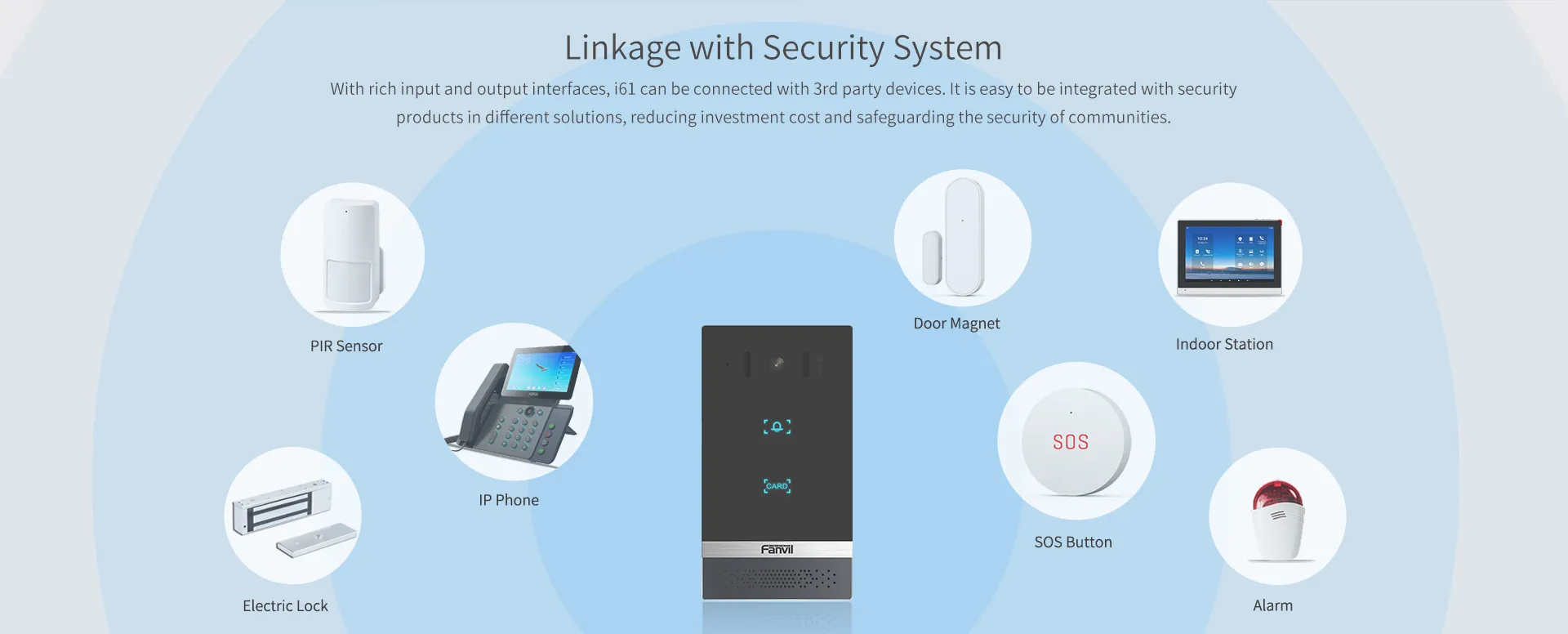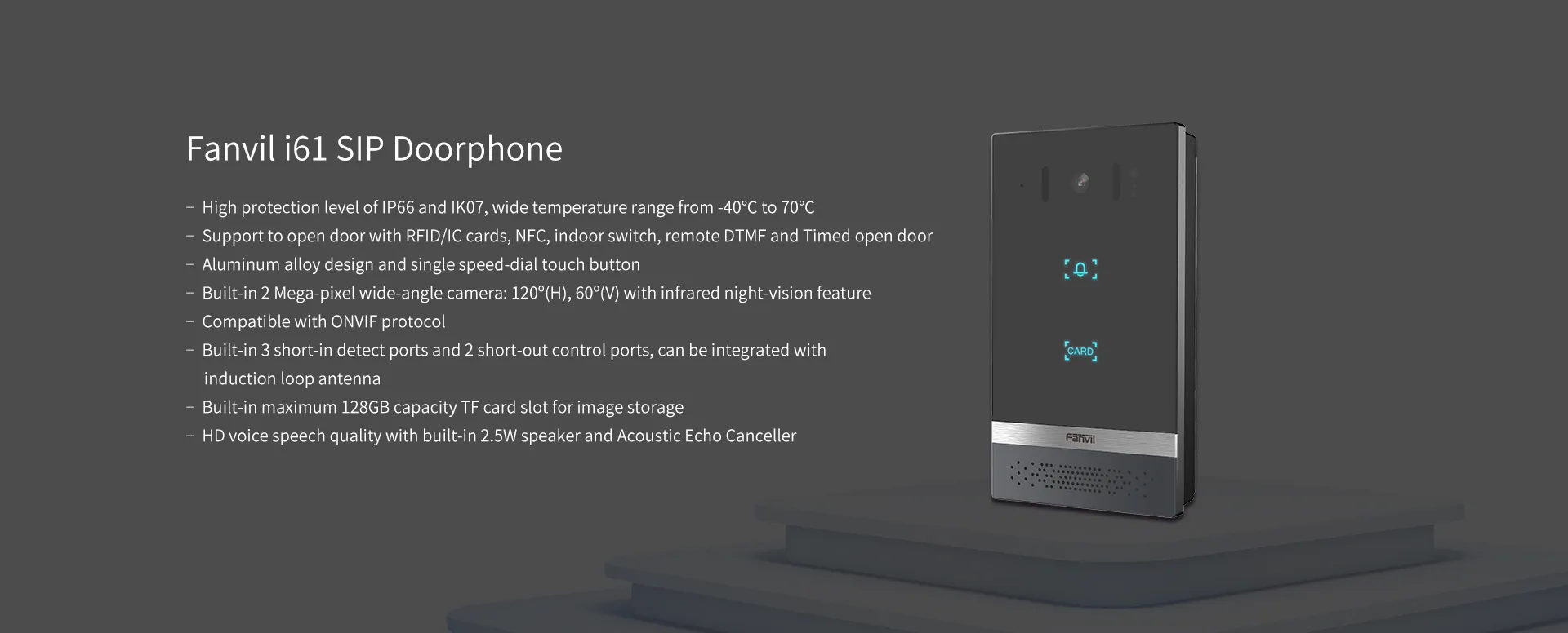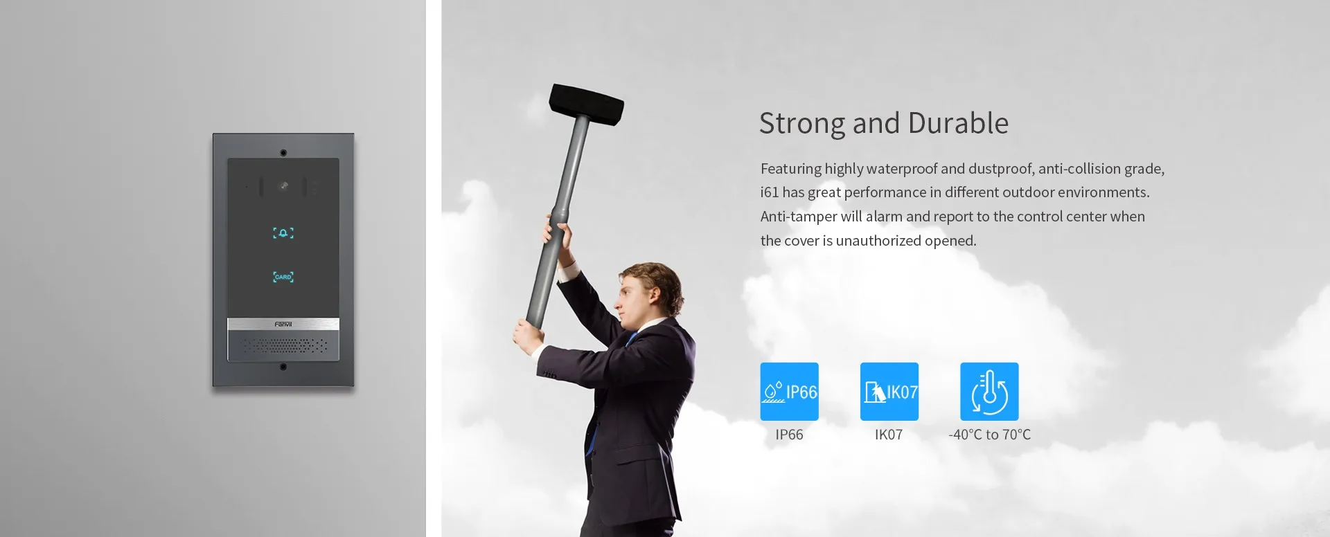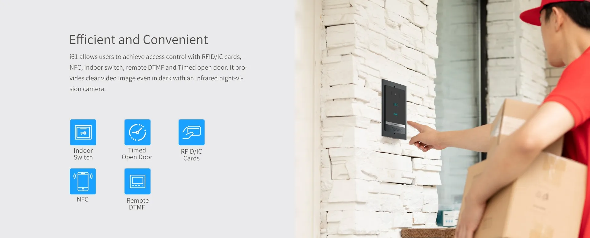 i61 เป็นวีดีโอดอร์โฟน ที่ใช้โปรโตคอล SIP และ ONVIF ซึ่งรวมฟังก์ชั่นการควบคุมการเข้าถึง อินเตอร์คอม และการป้องกันความปลอดภัยสูงสุดเข้าด้วยกัน โดดเด่นด้วยการออกแบบโลหะผสมอะลูมิเนียมและปุ่มสัมผัสแบบกดความเร็วเพียงปุ่มเดียว i61 มอบรูปลักษณ์ที่หรูหราคุณภาพสูง ด้วยระดับการป้องกัน IP66 และ IK07 สูง ทำให้สามารถกันน้ำ กันฝุ่น และป้องกันการชนในสภาพแวดล้อมกลางแจ้งส่วนใหญ่ i61 ช่วยให้ผู้ใช้สามารถโทรด้วยเสียง/วิดีโอผ่านปุ่มโทรด่วนและกล้อง 2 ล้านพิกเซล และควบคุมการเข้าถึงด้วยโหมดต่างๆ ด้วยอินเทอร์เฟซอินพุตและเอาต์พุตที่หลากหลาย i61 จึงเชื่อมโยงกับอุปกรณ์รักษาความปลอดภัยอื่นๆ ได้อย่างง่ายดาย และปรับแต่งเป็นโซลูชั่นต่างๆ ในอพาร์ทเมนต์ อาคารพาณิชย์ ชุมชน และสวนสาธารณะทางอุตสาหกรรม