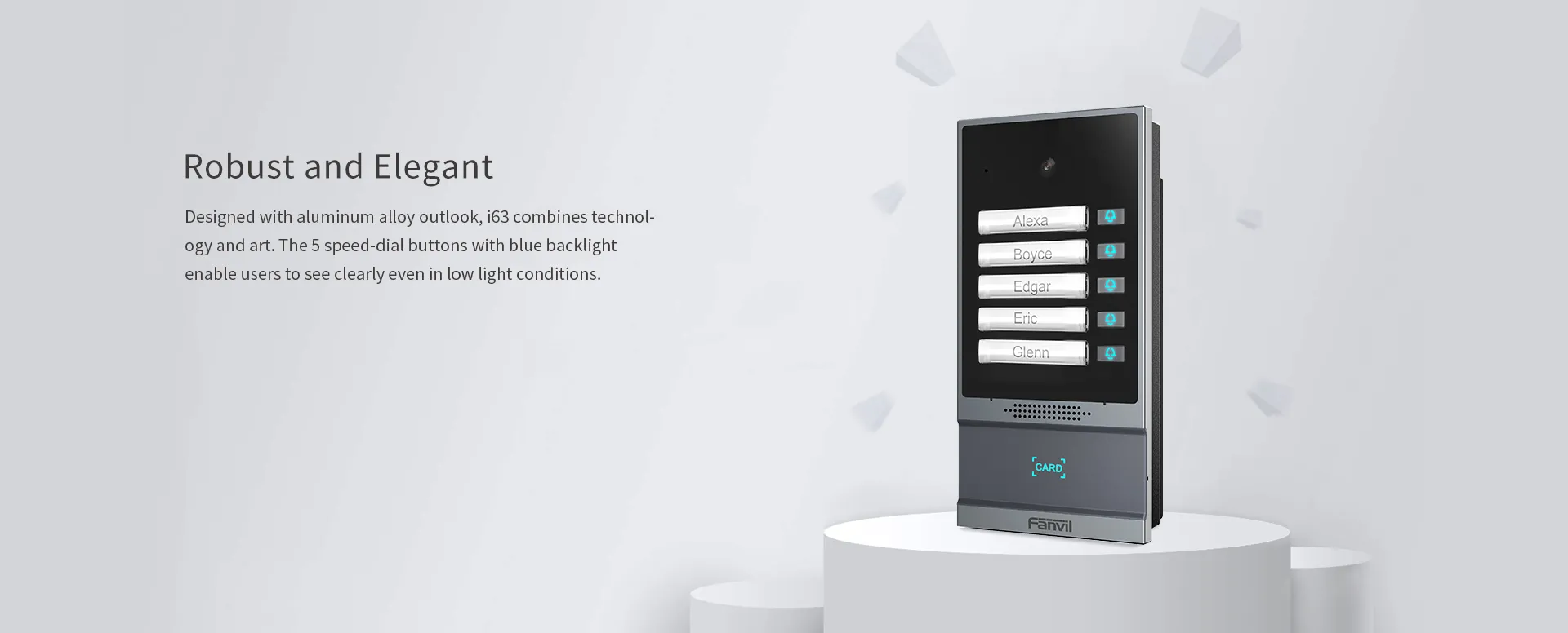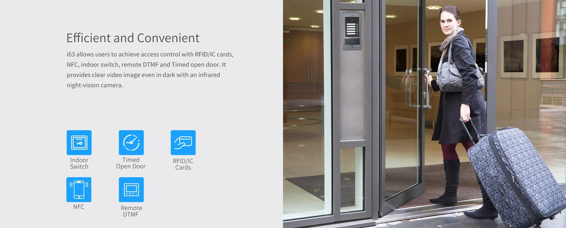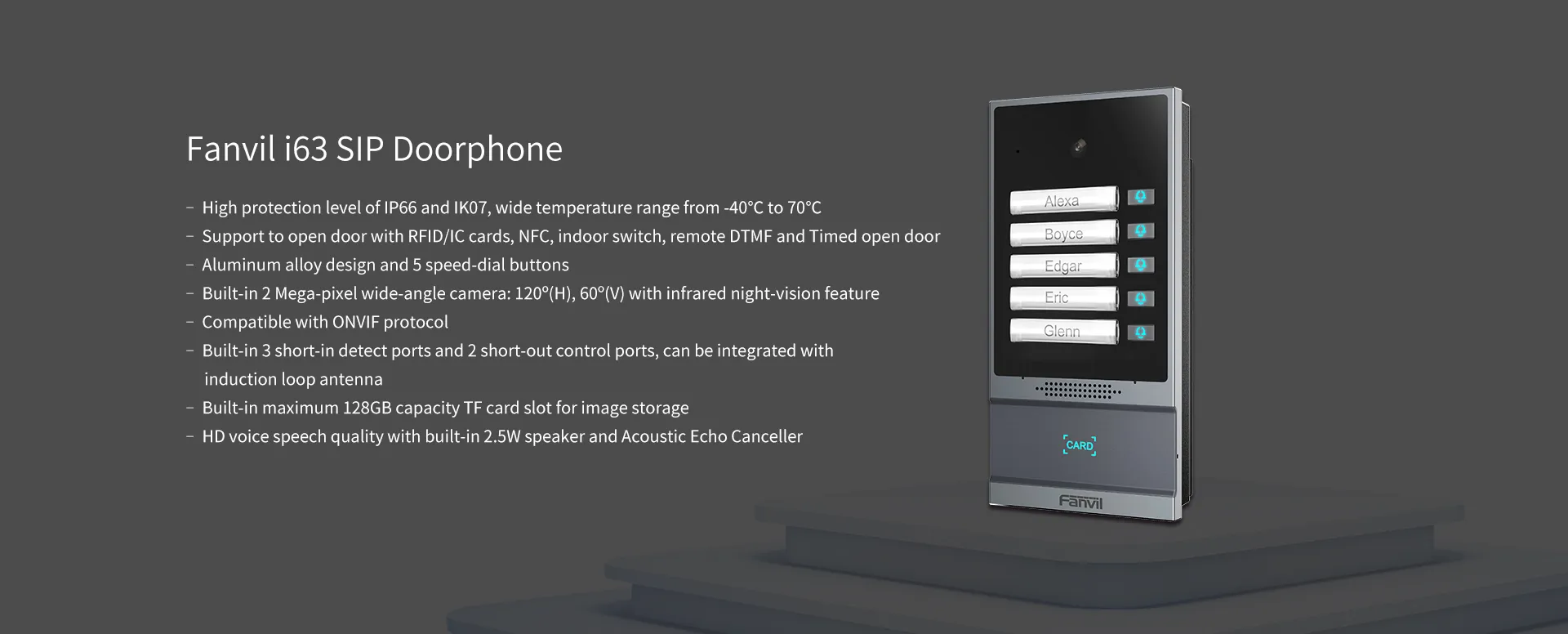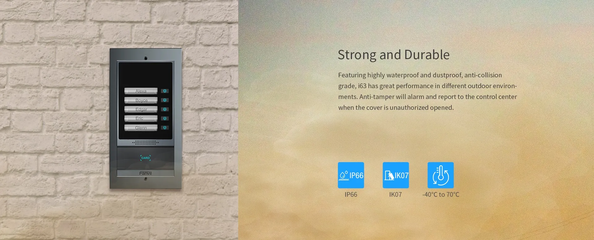 i63 เป็นวิดีโอดอร์โฟนที่ใช้โปรโตคอล SIP และ ONVIF ซึ่งรวมฟังก์ชั่นของการควบคุมการเข้าออก อินเตอร์คอม และการป้องกันความปลอดภัย โดดเด่นด้วยการออกแบบโลหะผสมอะลูมิเนียมและปุ่มโทรด่วน 5 ปุ่ม i63 มอบรูปลักษณ์ที่หรูหราคุณภาพสูง ด้วยระดับการป้องกัน IP66 และ IK07 สูง ทำให้สามารถกันน้ำ กันฝุ่น และป้องกันการชนในสภาพแวดล้อมกลางแจ้งส่วนใหญ่ i63 ช่วยให้ผู้ใช้โทรด้วยเสียง/วิดีโอผ่านปุ่มโทรด่วนและกล้อง 2 ล้านพิกเซล และควบคุมการเข้าถึงด้วยโหมดต่างๆ ด้วยอินเทอร์เฟซอินพุตและเอาต์พุตที่หลากหลาย i63 จึงง่ายต่อการเชื่อมโยงกับอุปกรณ์รักษาความปลอดภัยอื่นๆ และปรับแต่งเป็นโซลูชั่นต่างๆ ในอพาร์ทเมนต์ อาคารพาณิชย์ ชุมชน และสวนสาธาณะด้านอุตสาหกรรม