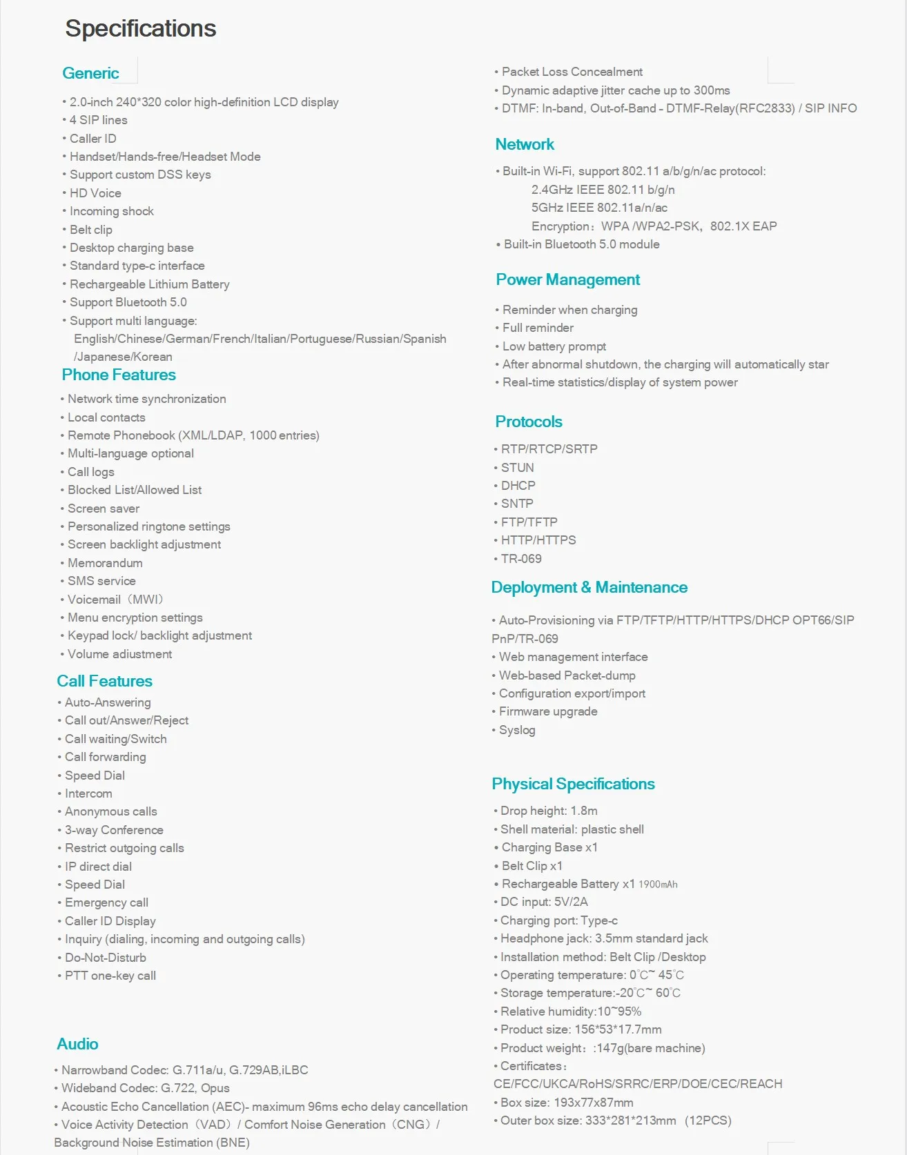 คุณสมบัติหลักของ Linkvil Fanvil W610W: