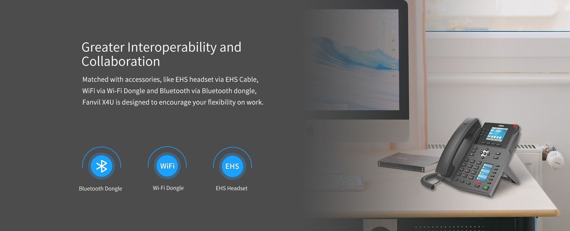Fanvil X4U ให้การเข้าถึงคำแนะนำได้โดยตรงด้วยหน้าจอสีความละเอียดสูง 320×240 สองจอ ซึ่งเป็นตัวเลือกที่เหมาะสำหรับองค์กรในการปรับปรุงความยืดหยุ่นและเพิ่มประสิทธิภาพในการทำงานประจำวัน ตัวแปลงสัญญาณไวด์แบนด์ของ G.722 และ Opus ในอุปกรณ์นี้มอบประสบการณ์เสียง HD ที่ชวนดื่มด่ำทั้งในย่านความถี่สูงและย่านความถี่ต่ำด้วยเครือข่าย