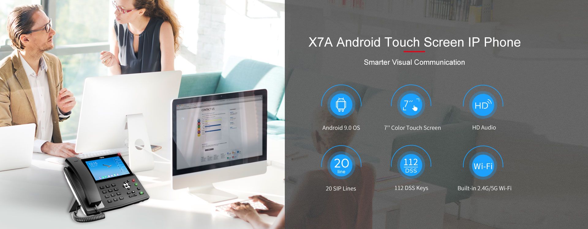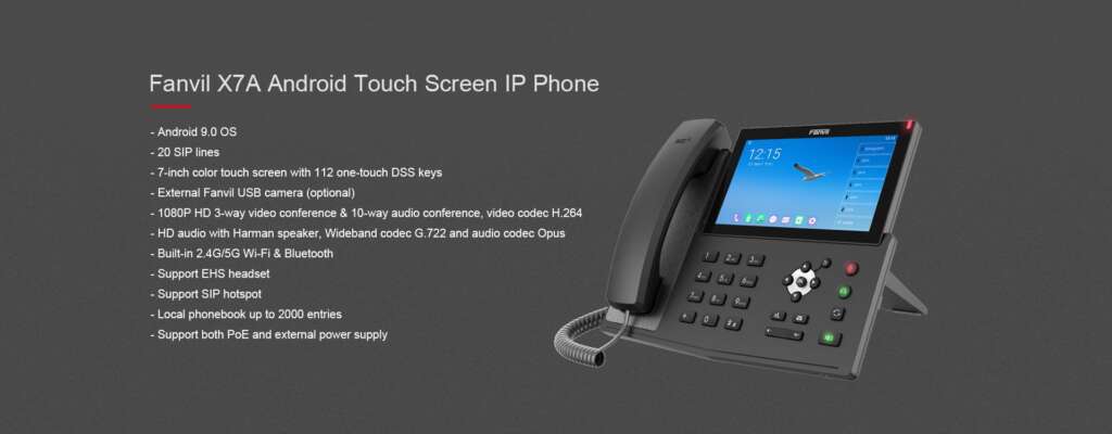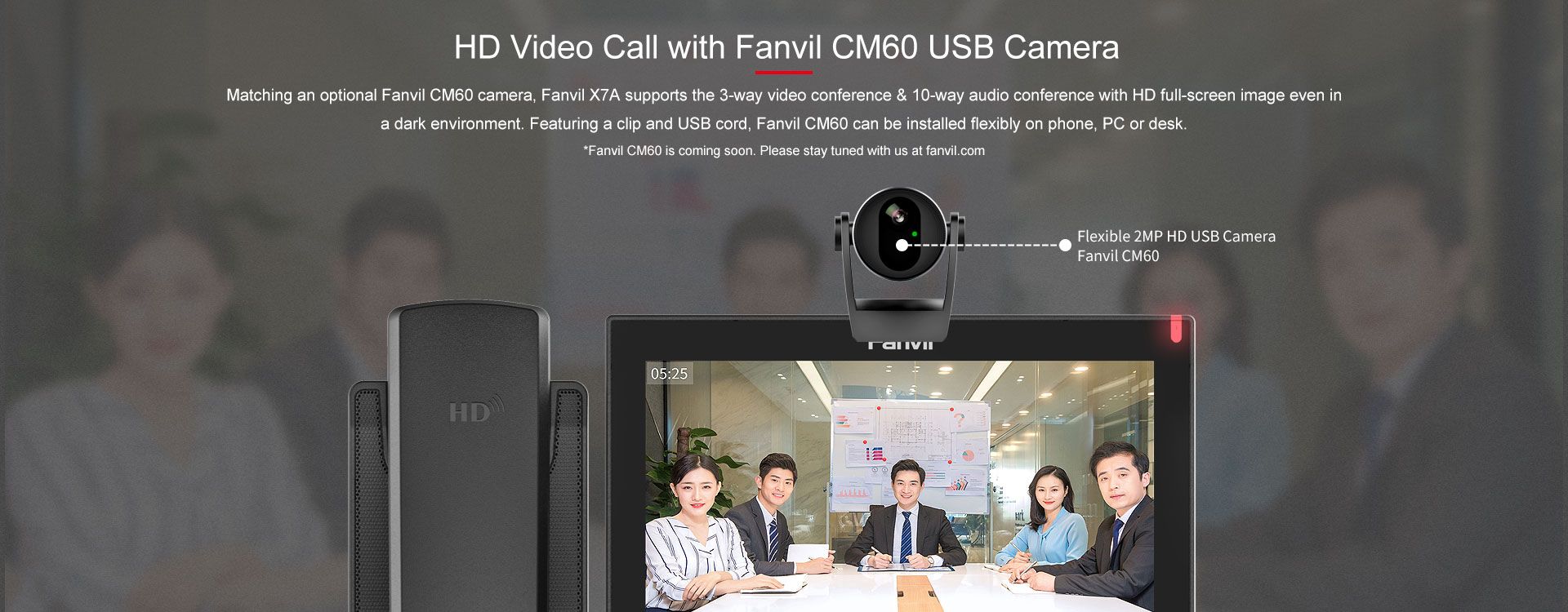 Fanvil X7A เป็นโทรศัพท์ IP สำหรับองค์กรระดับไฮเอนด์ที่มีระบบปฏิบัติการ Android 9.0. Fanvil X7A มอบประสบการณ์การใช้งานระบบสัมผัสที่ชาญฉลาดและราบรื่นยิ่งขึ้นสำหรับผู้ใช้งาน ซึ่งมีปุ่ม DSS 112 ปุ่มบนหน้าจอสัมผัสสีขนาด 7 นิ้ว, Wi-Fi ในตัว, บลูทูธในตัว ทำให้การสื่อสารในแต่ละวันฉลาดขึ้นและง่ายขึ้น Fanvil X7A จับคู่กับกล้อง USB CM60 ที่เป็นอุปกรณ์เสริม สามารถมอบเสียงและวิดีโอที่ยอดเยี่ยมสำหรับการประชุมกลุ่ม