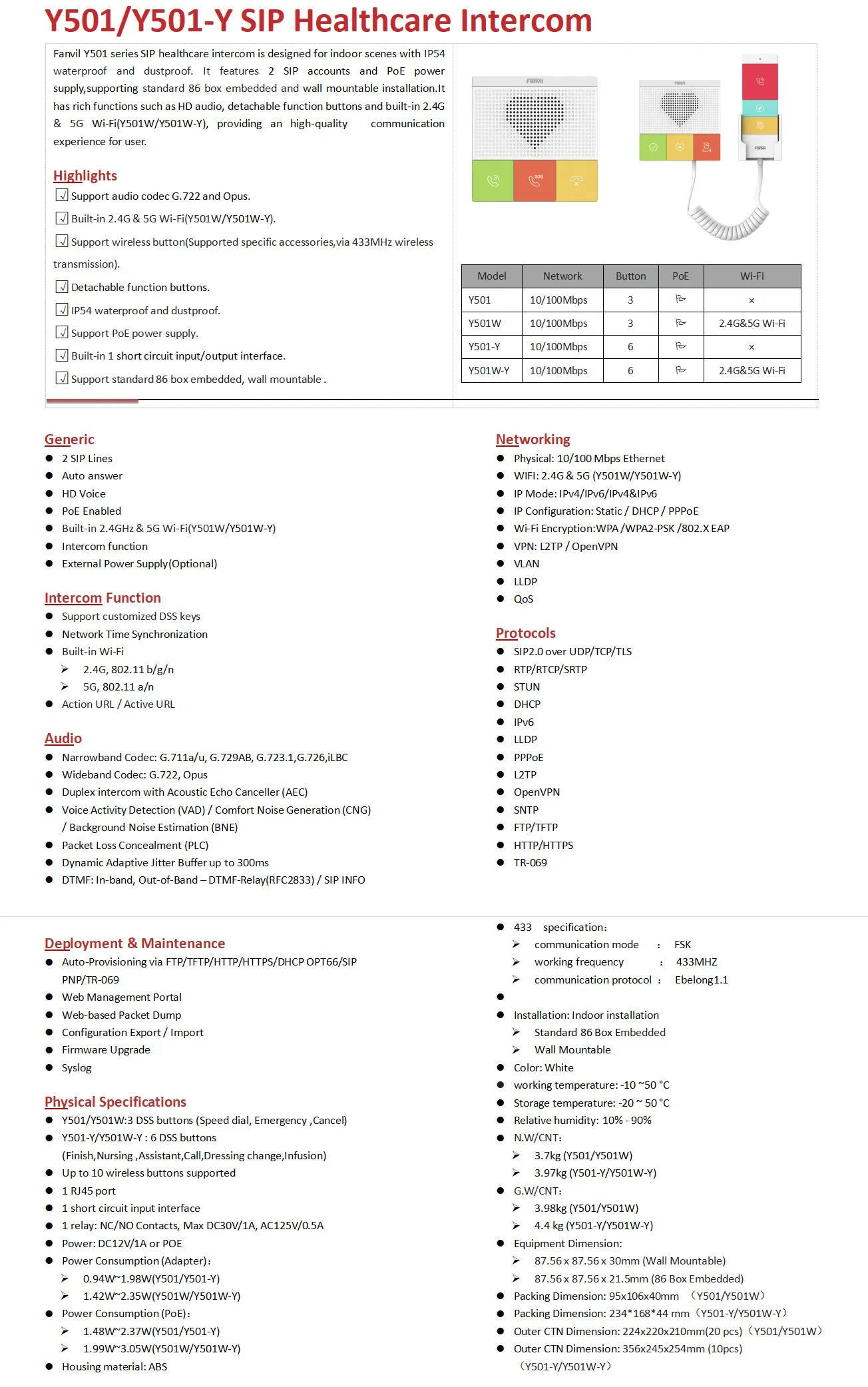 Fanvil SIP Healthcare Intercom : Model Y501/Y501-Y