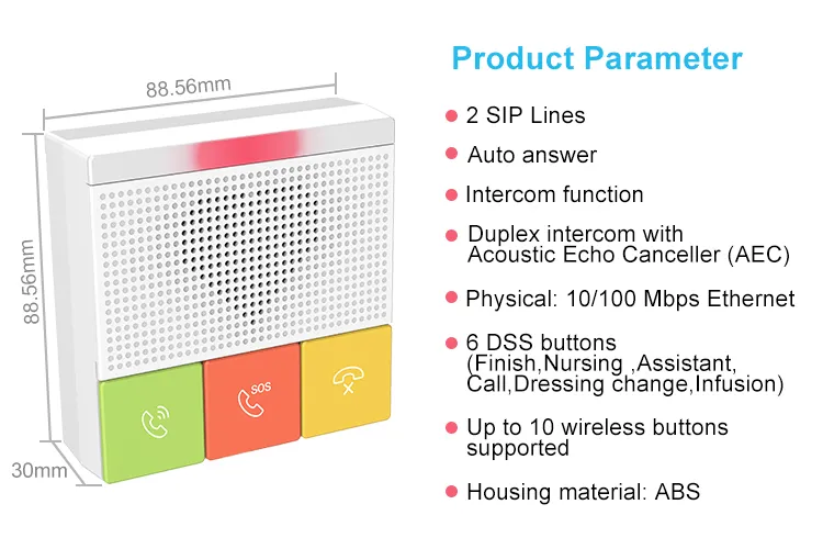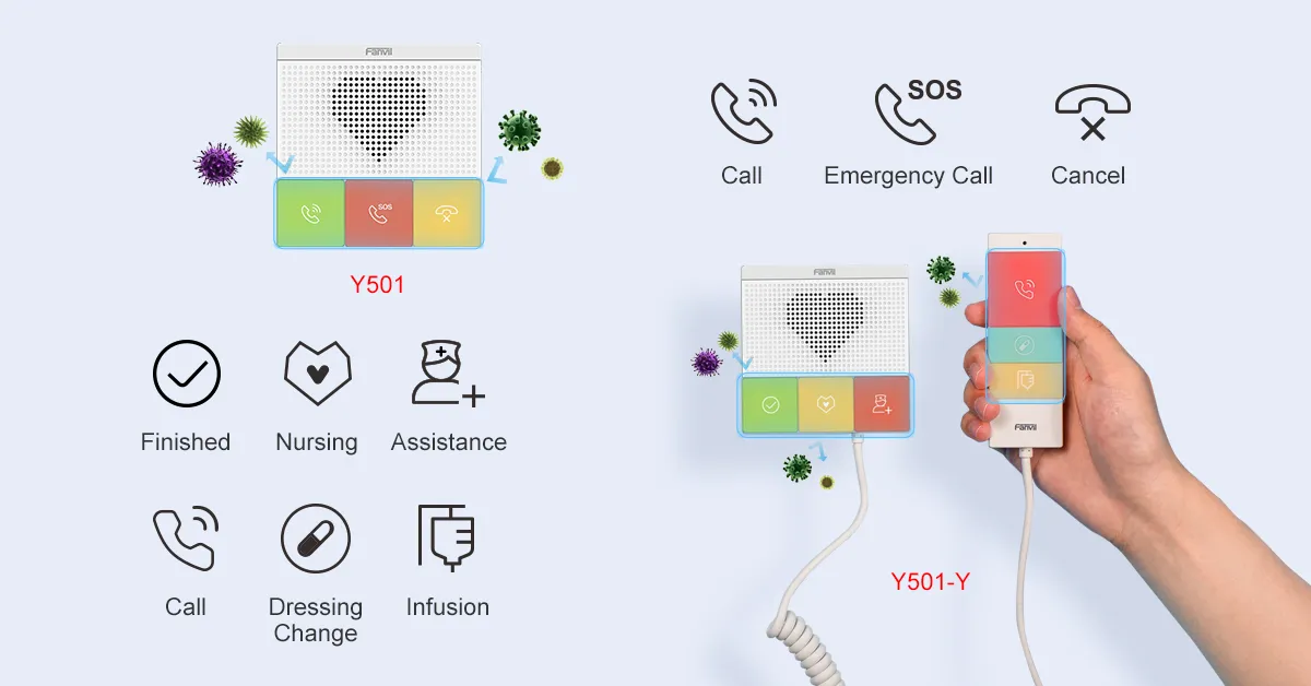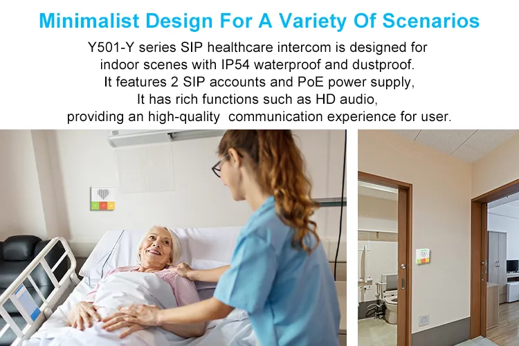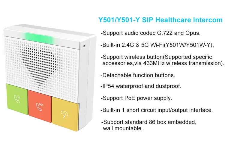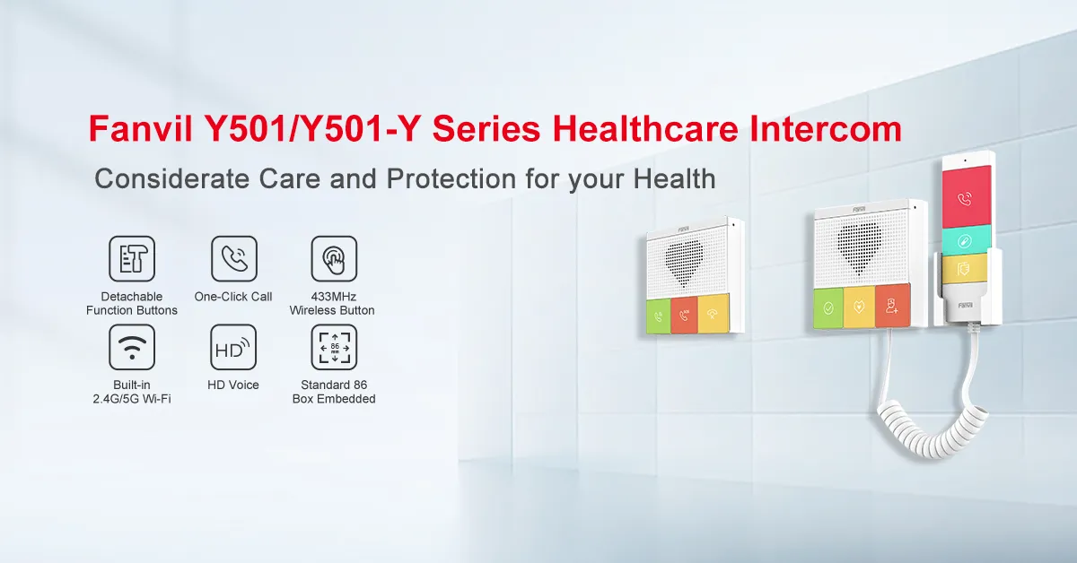 อินเตอร์คอมเพื่อการดูแลสุขภาพ แบบ SIP ซีรี่ส์ Y501ของ Fanvil ได้รับการออกแบบสำหรับสถานที่ภายในอาคารโดยกันน้ำและกันฝุ่นระดับ IP54 โดยมีบัญชี SIP 2 บัญชี และแหล่งจ่ายไฟ PoE รองรับการติดตั้งแบบติดผนังได้ มีฟังก์ชั่นที่หลากหลาย เช่น เสียง HD, ปุ่มฟังก์ชั่นทีปรับเปลี่ยนเองได้ และมี Wi-Fi 2.4G และ 5G ในตัว (Y501W/Y501W-Y) มอบประสบการณ์การสื่อสารคุณภาพสูงสำหรับผู้ใช้